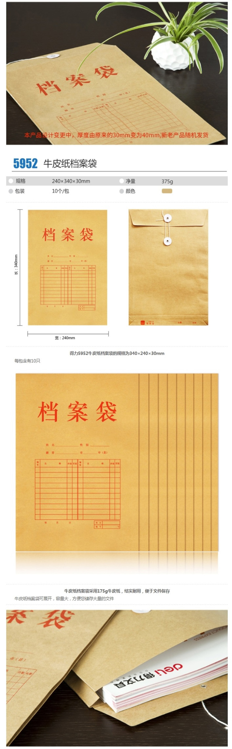 得力牛皮纸档案盒 5921 310*220*40mm 10个/包