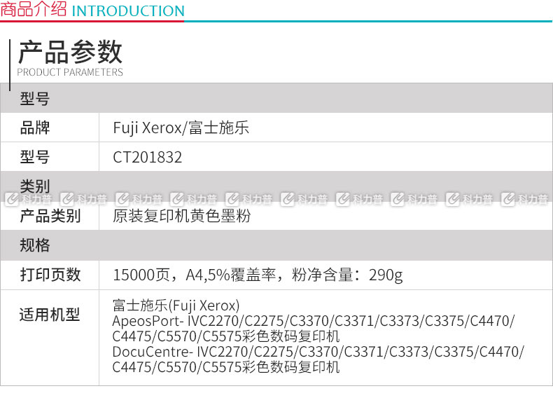 富士施乐 FUJI XEROX 复印机墨粉 CT201832 (黄色) 适用于2275/3373/3375/4475/5575